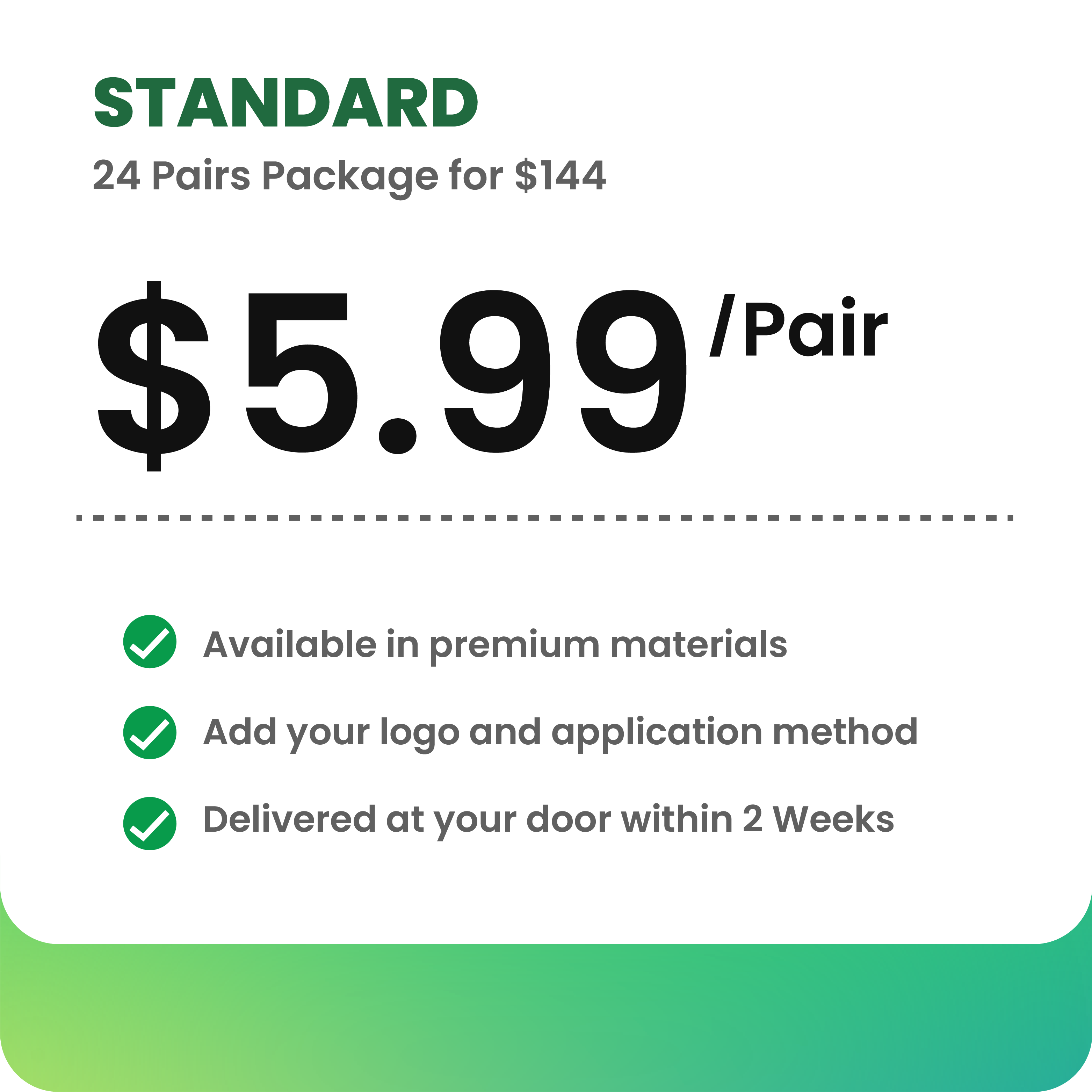 If you would like to see the quality and effect before you order 24 pairs, 60 pairs or 120 pairs, you can place a trial order below.