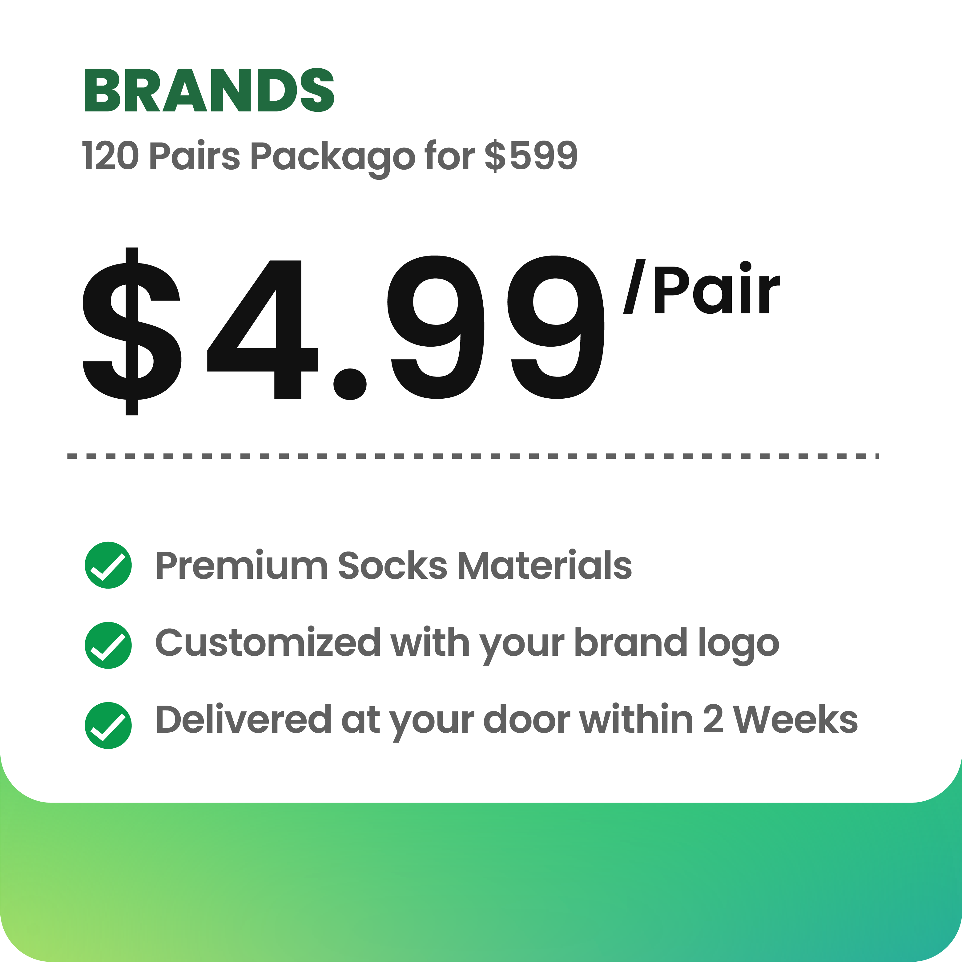 After your select your sock style, material and logo application method and upload your logo. It will take us 2 weeks from the time you place the order to the time we deliver your custom branded socks at your doorstep. We offer free shipping for 24 pairs, 60 pairs and 120 packages.