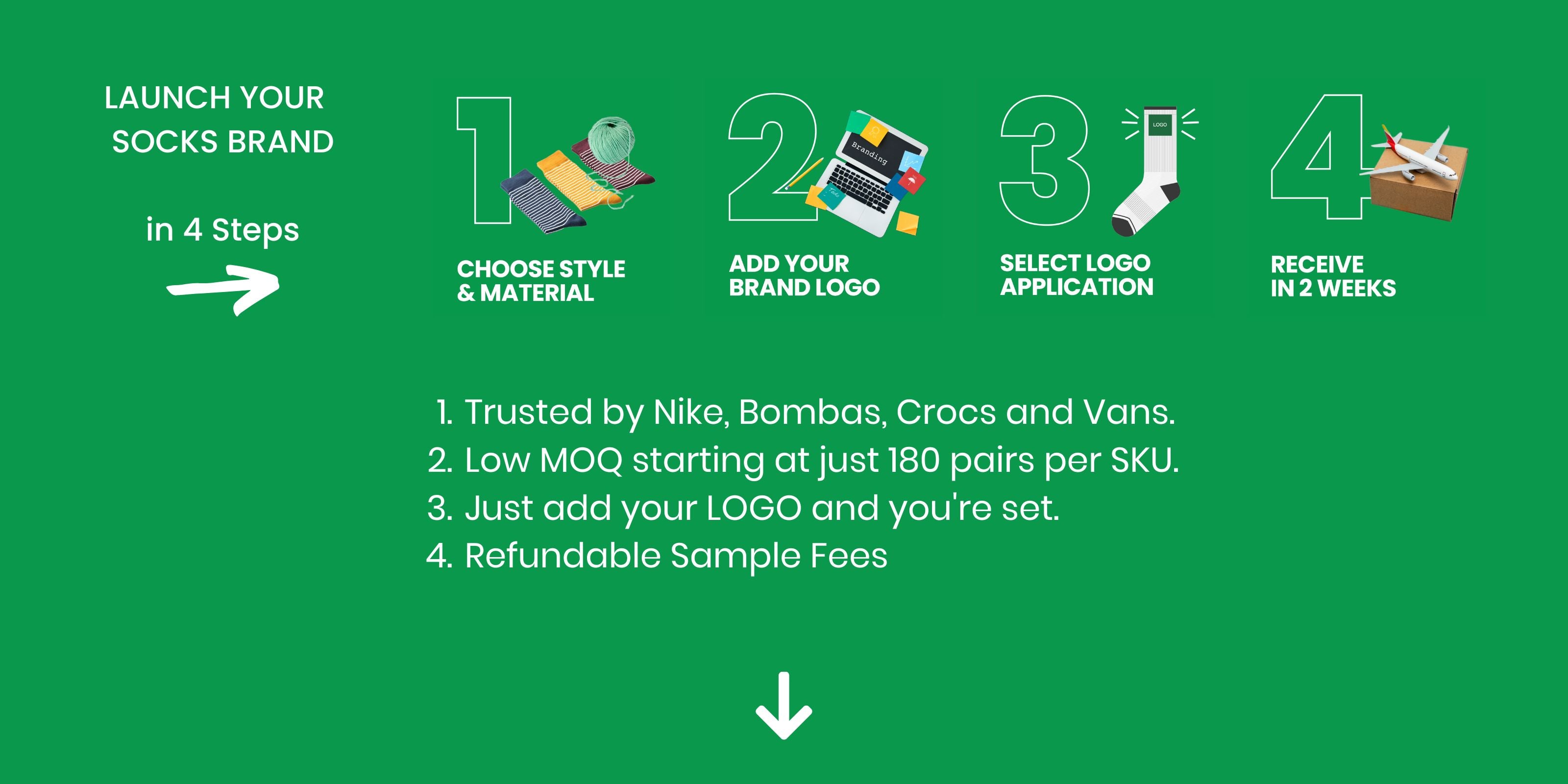 Start with our inventory socks ready for customization, just add your brand logo and no need for sample development fees.